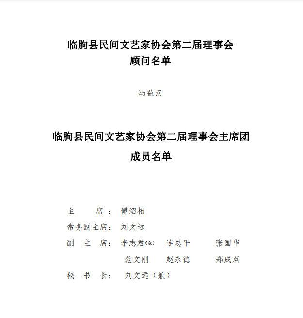 傅紹相當(dāng)選縣民協(xié)第二屆主席,劉文遠(yuǎn)當(dāng)選常務(wù)副主席,李志君、連恩平、張國華、范文剛、趙永德、鄭成雙當(dāng)選副主席,劉文遠(yuǎn)當(dāng)選秘書長(zhǎng),聘請(qǐng)馮益漢為藝術(shù)顧問。