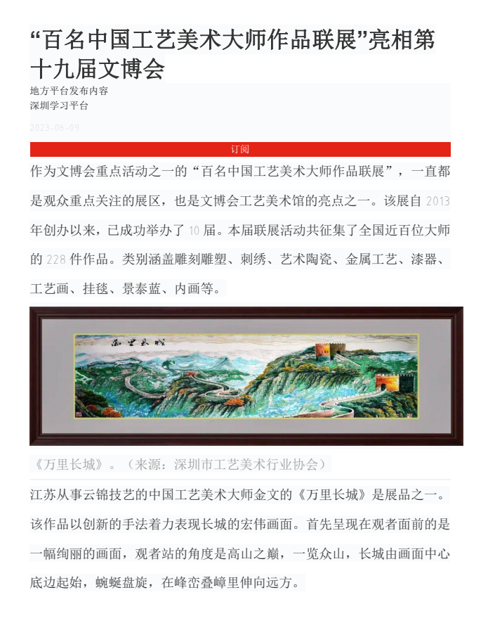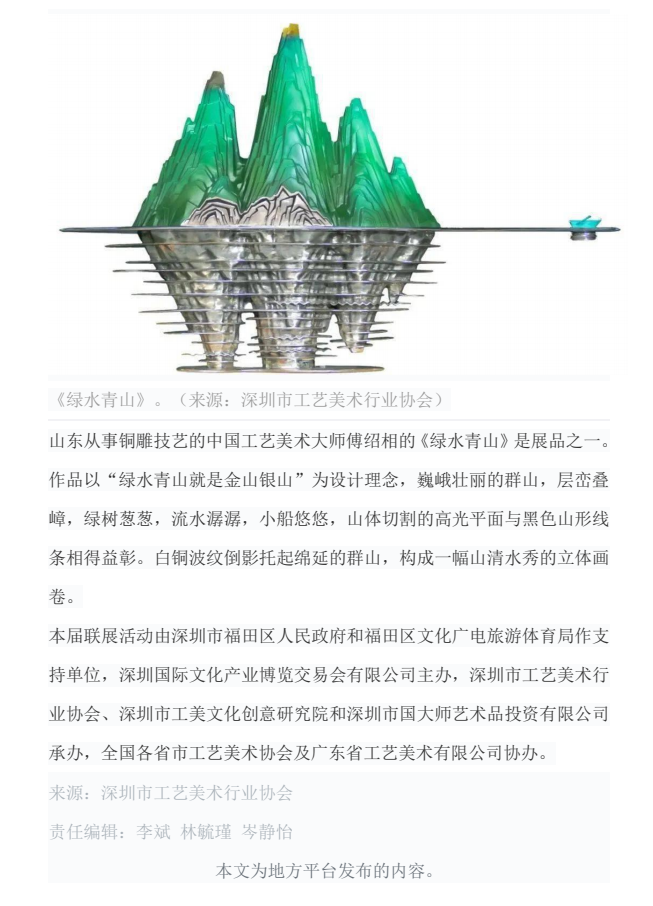 此次文博會(huì)以“工美智造?品質(zhì)生活”為主題,其中“非遺?工藝美術(shù)?藝術(shù)設(shè)計(jì)館”在14號(hào)館展出,同時(shí)舉辦“第十屆百名中國(guó)工藝美術(shù)大師作品聯(lián)展”。此館是中外嘉賓及觀眾重點(diǎn)關(guān)注的展區(qū)。本屆聯(lián)展邀請(qǐng)到了28位中國(guó)工藝美術(shù)大師參加活動(dòng),征集了全國(guó)近百位大師的228件作品,類別涵蓋雕刻雕塑、刺繡、藝術(shù)陶藝、金屬工藝、漆器、工藝畫、掛毯、景泰藍(lán)、內(nèi)畫等。6月7日上午,中共政治局委員、中宣部部長(zhǎng)李書磊,中共政治局委員、廣東省委書記黃坤明等黨和國(guó)家領(lǐng)導(dǎo)人及省、市有關(guān)領(lǐng)導(dǎo)參觀了“百名中國(guó)工藝美術(shù)大師作品聯(lián)展”。精湛的技藝、精美絕倫的大師作品,贏得了各級(jí)領(lǐng)導(dǎo)和嘉賓駐足欣賞,并高度贊譽(yù)。傅紹相大師的參展作品《綠水青山》《一路祥瑞》,由深圳市工藝美術(shù)行業(yè)協(xié)會(huì)廉建利會(huì)長(zhǎng)向領(lǐng)導(dǎo)作了介紹,具有現(xiàn)代藝術(shù)氣息,充滿正能量,新青銅技藝的《綠水青山》《一路祥瑞》作品得到了各位領(lǐng)導(dǎo)的高度贊譽(yù)。傅紹相大師另一件作品《九鹿鳴春》在11號(hào)館福田展廳展出,參觀的觀眾絡(luò)繹不絕,紛紛駐足觀看。展會(huì)期間,傅紹相接受了深圳電視臺(tái)記者的采訪并參加了“硯雕暨文房清玩作品鑒評(píng)會(huì)”、“工藝美術(shù)‘工美智造?品質(zhì)生活’暨后疫情時(shí)代下工藝美術(shù)行業(yè)現(xiàn)狀、機(jī)遇高質(zhì)量發(fā)展研討會(huì)”。欣賞各位國(guó)大師的精品力作,領(lǐng)略大師們的藝術(shù)風(fēng)范,細(xì)品大師作品的藝術(shù)氣息,受益匪淺。