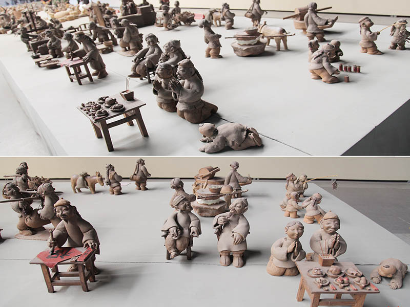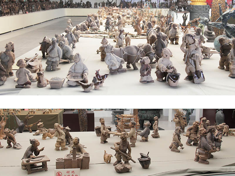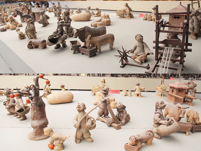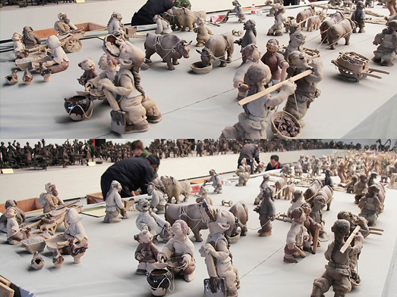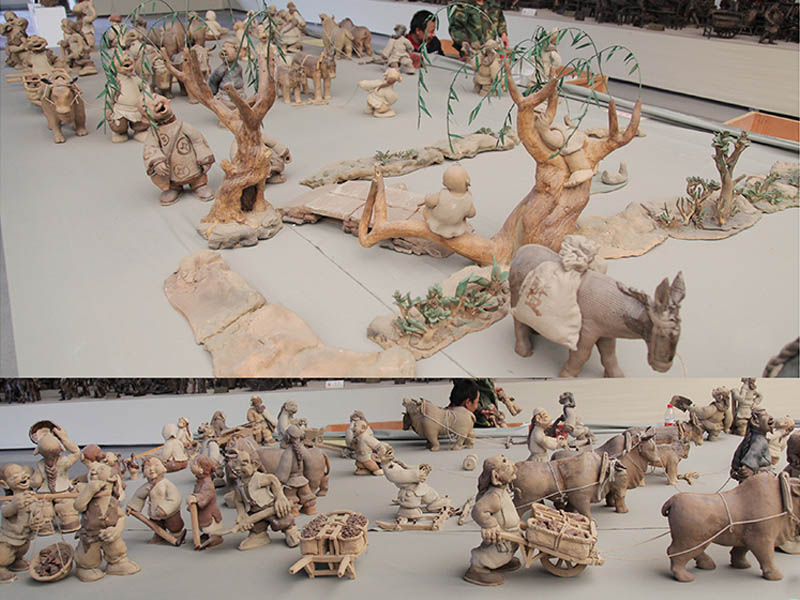大型陶藝民俗情景組合群雕《莊戶日子》由山東省工藝美術(shù)大師傅紹相先生和陶藝家蔡杰先生策劃創(chuàng)意,采用陶藝的手法,經(jīng)陶藝技術(shù)人員歷時(shí)2個(gè)月手工捏制和1200度窯爐高溫?zé)贫?。該群雕取材于清朝馬益著的《莊農(nóng)日用雜字》,真實(shí)的再現(xiàn)了清朝時(shí)期農(nóng)民從春天“開凍先出糞”到歲末“辭灶在眼前”一年中,農(nóng)民農(nóng)事和社會(huì)活動(dòng)的情景,揭示了農(nóng)民生產(chǎn)生活的真諦,表現(xiàn)了濃郁的地方風(fēng)俗民情。該群雕為架上群雕,長(zhǎng)22米,寬3米,由 222個(gè)人物和場(chǎng)景單體組成,其中人物 122尊。構(gòu)成了一個(gè)緊張、繁忙、熱烈、喜慶的生產(chǎn)生活大場(chǎng)面,具有強(qiáng)烈的民間藝術(shù)氛圍,充分顯示了傳統(tǒng)文化的深厚底蘊(yùn),體現(xiàn)了傳統(tǒng)文化的廣泛影響,表達(dá)了人們對(duì)傳統(tǒng)文化的熱愛和對(duì)美好生活的向往。該群雕具有立體感強(qiáng),形象逼真,栩栩如生,看后印象深刻,收藏多少年也不會(huì)變樣的特點(diǎn)。該群雕共分為四個(gè)版塊: